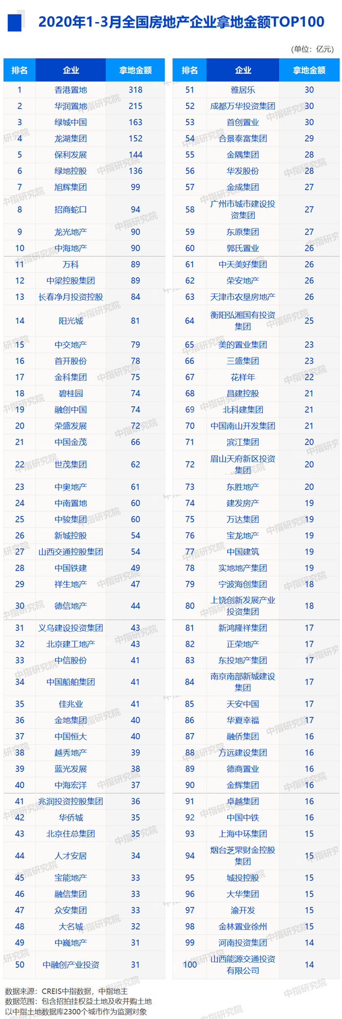 2020年1-3月全国房地产企业拿地排行榜