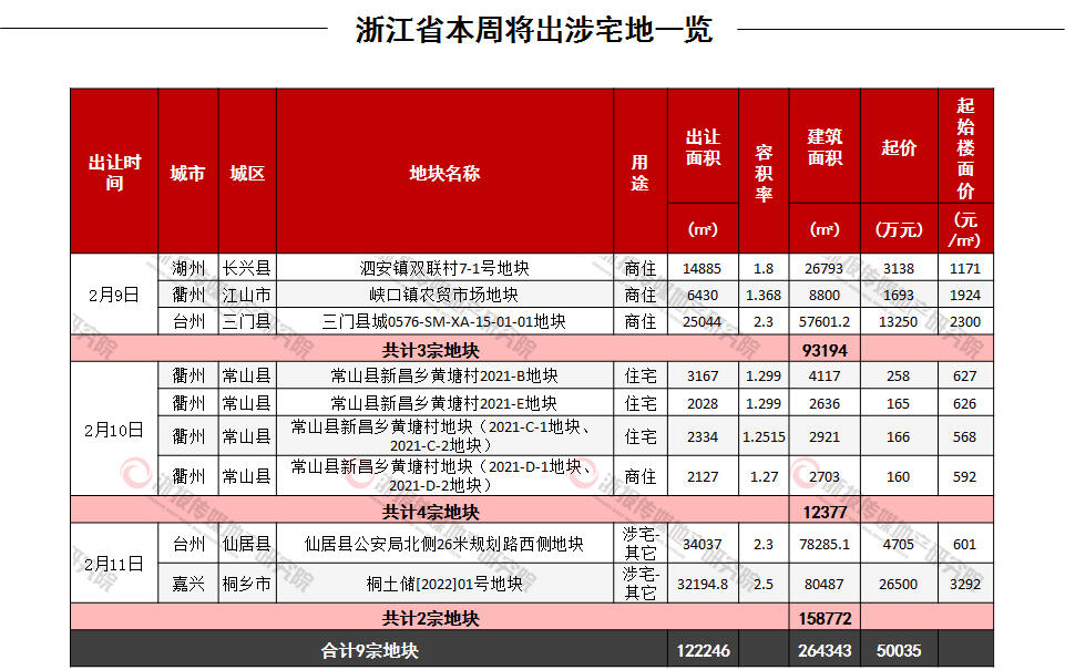 本周三将迎来虎年涉宅地首次出让:包括三宗涉宅地,涉及湖州长兴、衢州江山、台州三门,总用地面积4.6万方,总出让建面9.3万方,总起始总价1.8亿元。