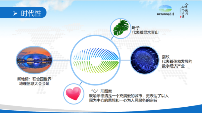 在德清城市品牌视觉标识设计方面,则充分考虑了时代性和未来感。梁建红介绍,德清设计灵感源于德清城市新地标联合国世界地理信息大会会址。从整体看,会址加倒影既像一片叶子,代表着绿水青山;也像一枚指纹,代表着蓬勃发展的数字经济产业。中间核心的心形图案,既喻示德清是一个充满爱的城市,更表达了以人民为中心的思想和全心全意为人民服务的根本宗旨。