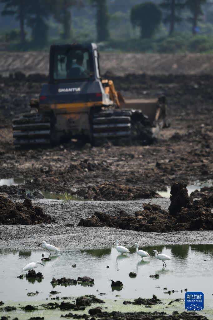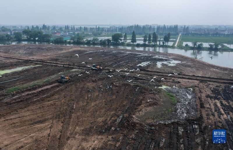 9月9日,在湖州市吴兴区东林镇东升村,工程机械在进行土地开发整理,完成后这里将成为粮食功能区(无人机照片)。
