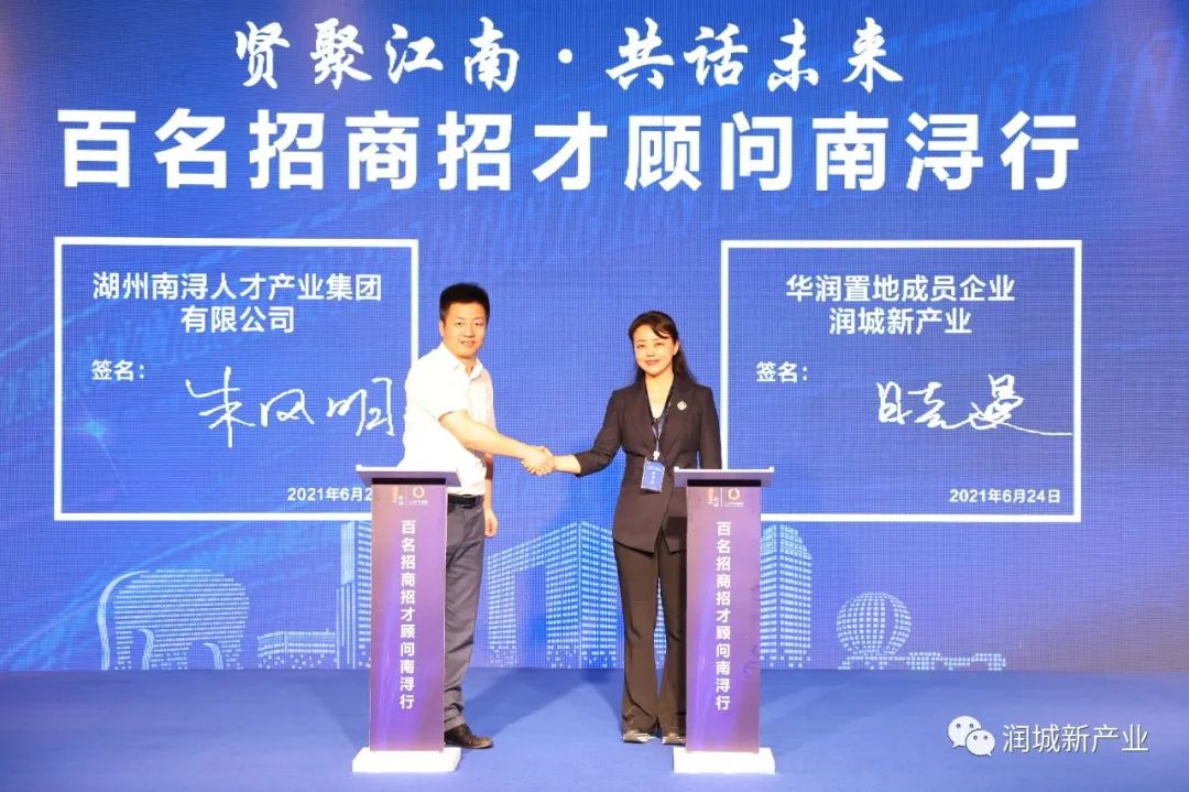 在中共南浔区委副书记、区长温建飞,中共南浔区委常委、组织部长、统战部长范海鸣,南浔区人民政府副区长费学梅等领导的见证下,润城新产业与南浔人才产业集团正式签署战略合作协议。湖州南浔人才产业集团有限公司董事长周剑明、湖州南浔人才产业集团有限公司总经理朱风明、华润置地科技创新部助理总经理晓曼、润城新产业华东区域公司总经理汪良栋、华润置地科技创新部总监缪青等参与签约。