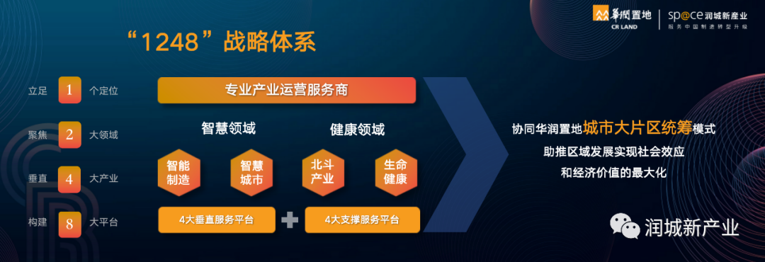 作为华润置地旗下成员企业,润城新产业围绕“服务中国制造转型升级”这一战略使命,聚焦“专业产业运营服务商”这一战略定位,深耕智慧领域和健康领域。针对产业发展、区域转型升级所关注的“技术策源、供需互联、集群发展和产城融合”等核心诉求,打造8大产业服务平台,构建形成“1248”特色服务体系。