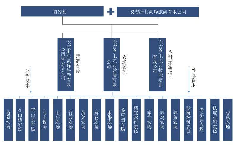 鲁家村引入安吉浙北灵峰旅游有限公司共同组建安吉鲁家乡土旅游公司,灵峰旅游占股 51%,鲁家村集体占股 49%,实现村集体资产的首轮价值转换,实现村民成为公司股民,鲁家乡土成为“鲁家村”的开发运营主体。